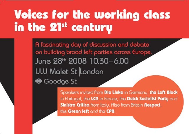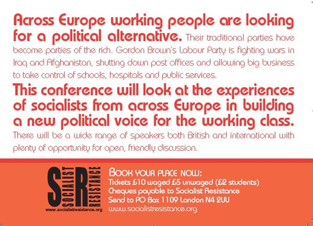 You can download the flyer for the Socialist Resistance dayschool on the European experience of broad parties here. We will have speakers from the Communist Party, the Greens, the LCR, Left Bloc and the Dutch Socialist Party plus your usual favourites.