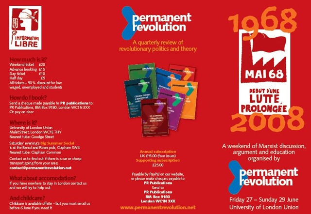 The SR event takes place on the Saturday. In the same building from Friday through till Sunday afternoon Permanent Revolution are having their annual shindig. Anyone who attends either event and leaves a comment that I don’t have to edit between now and then can claim a free pint from me in the ULU bar or the Marlborough between 5.30 and 7pm.
