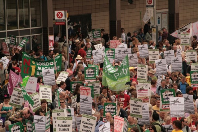 Our estimate was that there were about 6-7000 people on today’s demonstration against the expansion of Heathrow airport. To get an idea of the coalition of forces that built it have a look at the inventive Make A Noise site. It was, to be frank, something of a discouraging start. Everyone was penned in like sheep along a stretch of road near Hatton Cross station. The small number within earshot of the speakers at the front were treated to the Archbishop of Canterbury’s factotum reading out a very dull statement very dully. He was followed by someone who was introduced as the deputy mayor of London. I’d never heard of him and he could just as easily been the deputy sheriff of Tombstone. Still he was game and walked the length of the march.