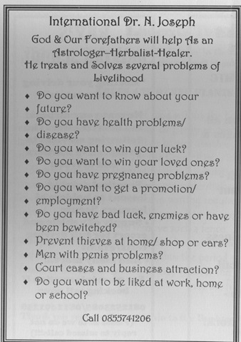 HelpIt’s pretty obvious from reading some of the comments left on this site that a lot of people need a lot of help. I’ll draw a veil over some that don’t make it past the moderation stage. Anyway here is something I picked up in Luderitz – where the action isn’t. It’s an advert from a local newsheet offering assistance for anyone wanting to be liked, having problems in the trouser department or just a bit unlucky. The code for Luderitz is (264) 063.