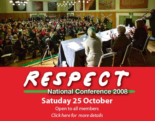 Respect is holding its national conference in London on 25th October 2008, at the Bishopsgate Centre, 230 Bishopsgate, London EC2M 4QH. Registration starts at 10am.