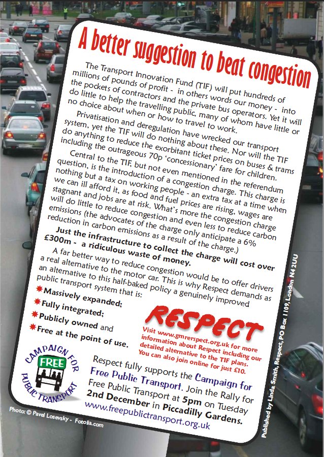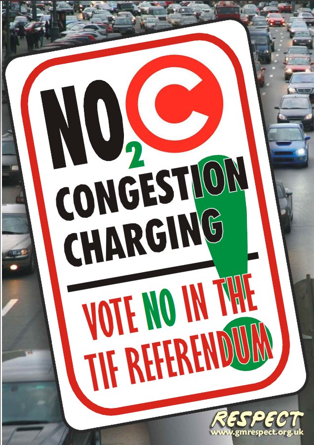 Respect in Manchester is opposing the Congestion charge for a range of reasons – not least is the fact that we are going to be saddled with a £300 million debt just to build the gantries to collect the charge as people drive into the city. That means we will have to pay – via PFI – for the next 25 years. The aim is only to reduce congestion by 30% at peak times. They need the remaining cars to pay the bills. We believe that we need to move away from cars altogether within the city and the TIF bid will make that harder not easier as it will lock car mass use into the regions funding for the next twenty five years while tackling climate change requires us to take measures to reduce car use dramatically. That is why we are campaigning for free public transport as well.