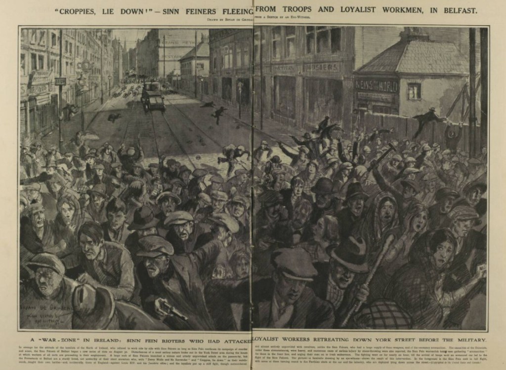 Skipping forward to the 1920s, 6000 Catholic dockers and leftwing Protestants (“rotten Prods”) were driven out of the shipyards and there was widespread rioting in the city.