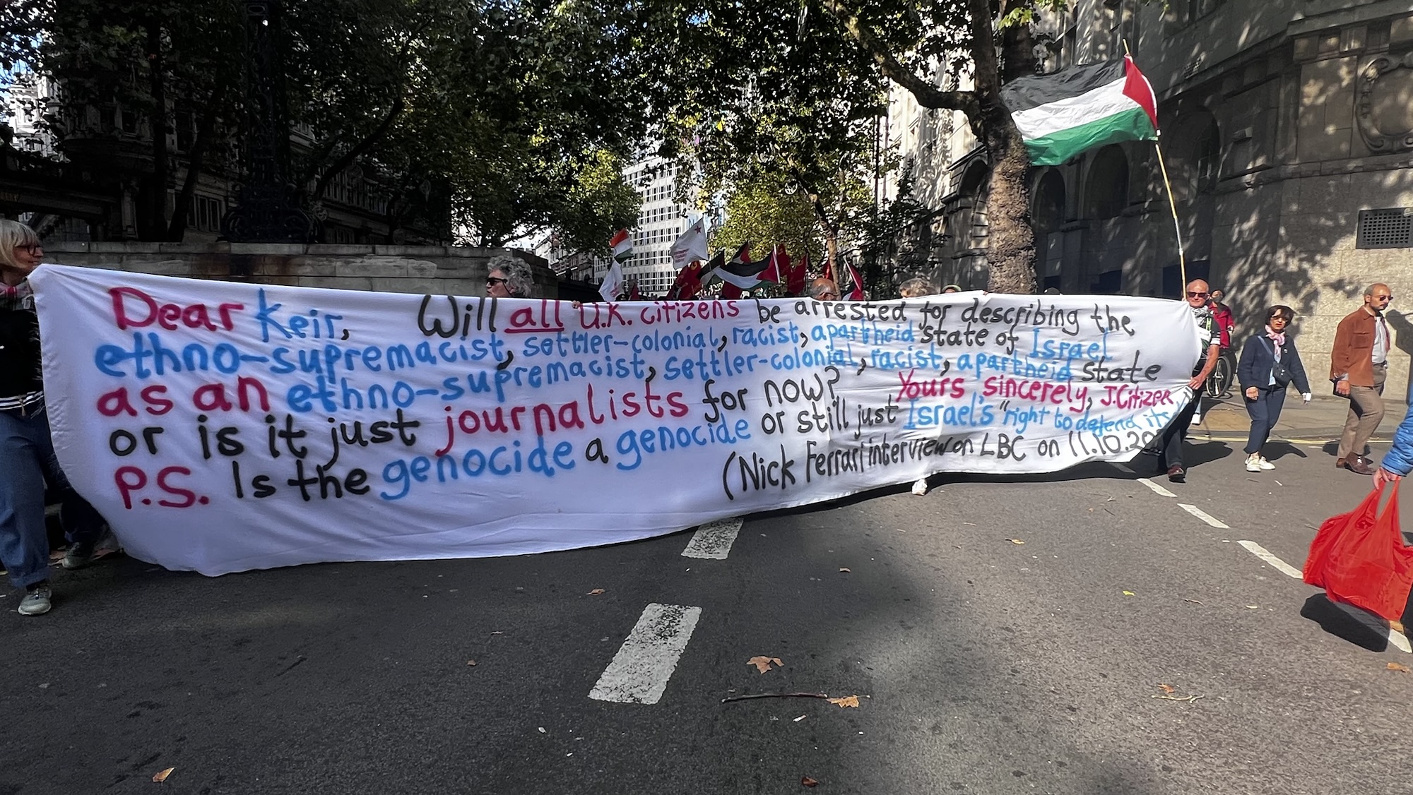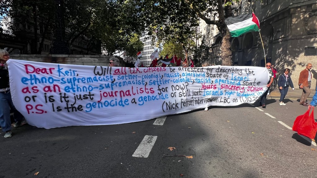 What was most impressive was that this was a protest which was bringing tens of thousands of young people into radical, anti-imperialist politics for the first time. They also instinctively understood that the main enemy is at home and most of the home-made placards and banners were targeted at Starmer who continues to give unconditional support to Israel, even if electoral considerations have obliged him to make some hand wringing homoeopathically mild criticisms of the scale of the slaughter being conducted by the IDF and flog the dead horse of a two state solution, a beast that was sent to the glue factory years ago.