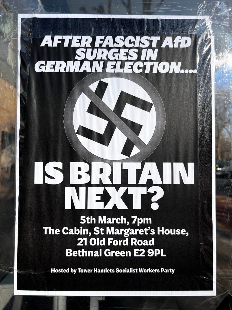 Maybe these points will be made in Thursday’s meeting but there is something on TV that night and I won’t be able to go. But while plastering the streets with big scary swastikas implying that we are all going to be sent off to camps on the Isle of Wight might be good for maintaining a sense of urgency, it is downright irresponsible politics which just miseducates people about what fascism really looks like and how imminent it is in Bethnal Green.