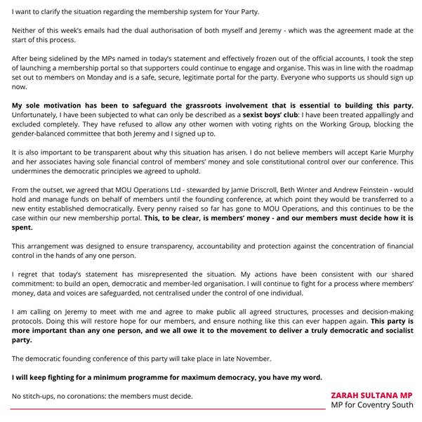 Zarah Sultana is demonstrating a much surer grasp of the new situation than Corbyn and the coterie of MPs, schemers and bureaucrats he has gathered around him. In her statement she names individuals, but much more importantly she offers a criticism of a political method. She talks of cliques suppressing dissenting views and a culture of sexism. The fact that the statement contradicting her was signed by a group of middle aged and elderly men rather bears out what she says. It was apparent in Your Party’s approach to the Greens that a culture of bureaucratic sectarianism had already been established and Sultana is now trying to fight it. Even the proposed method of selecting a large proportion of conference delegates seems constructed to ensure that no serious opposition can be offered to the leadership group which has already coalesced.