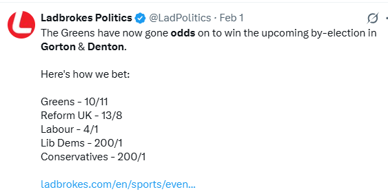 Renowned political pundits Ladbroke’s bookies are now saying that the Greens are the odds-on favourites to win the by-election and that was before the bandwagon to get Mandelson thrown into prison for corruption started. Labour’s position really could not be any weaker.