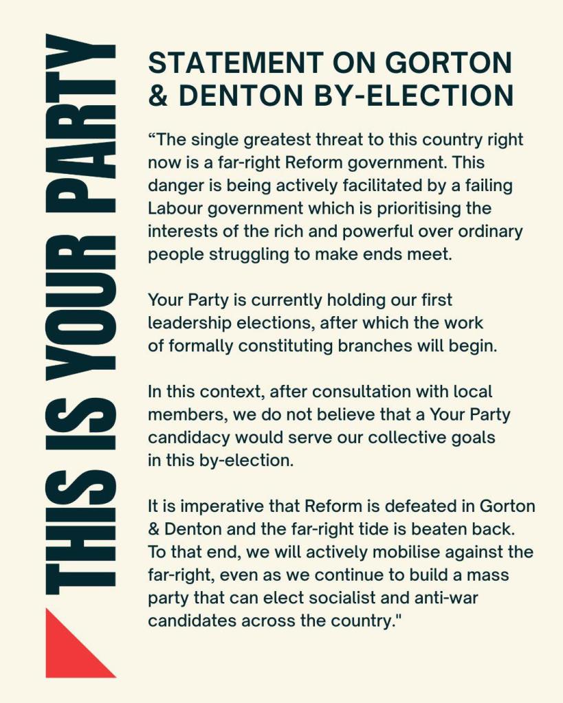 No such merit is to be found in the Your Party statement on the Gorton and Denton by-election. An AI summary would be something like “Reform have a real chance of winning the seat because Labour are rubbish. Someone really should do something but we’re too busy with internal stuff to decide on anything. Watch this space.”