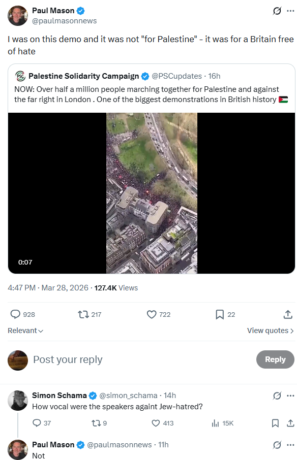 Unless you were in the vicinity of Paul Mason, a man for whom renegade is one of the kinder descriptions. In one of his rare breaks from tweeting about how hideously antisemitic the Green Party and all its members are, he commented that “I was on this demo and it was not “for Palestine” – it was for a Britain free of hate.”
